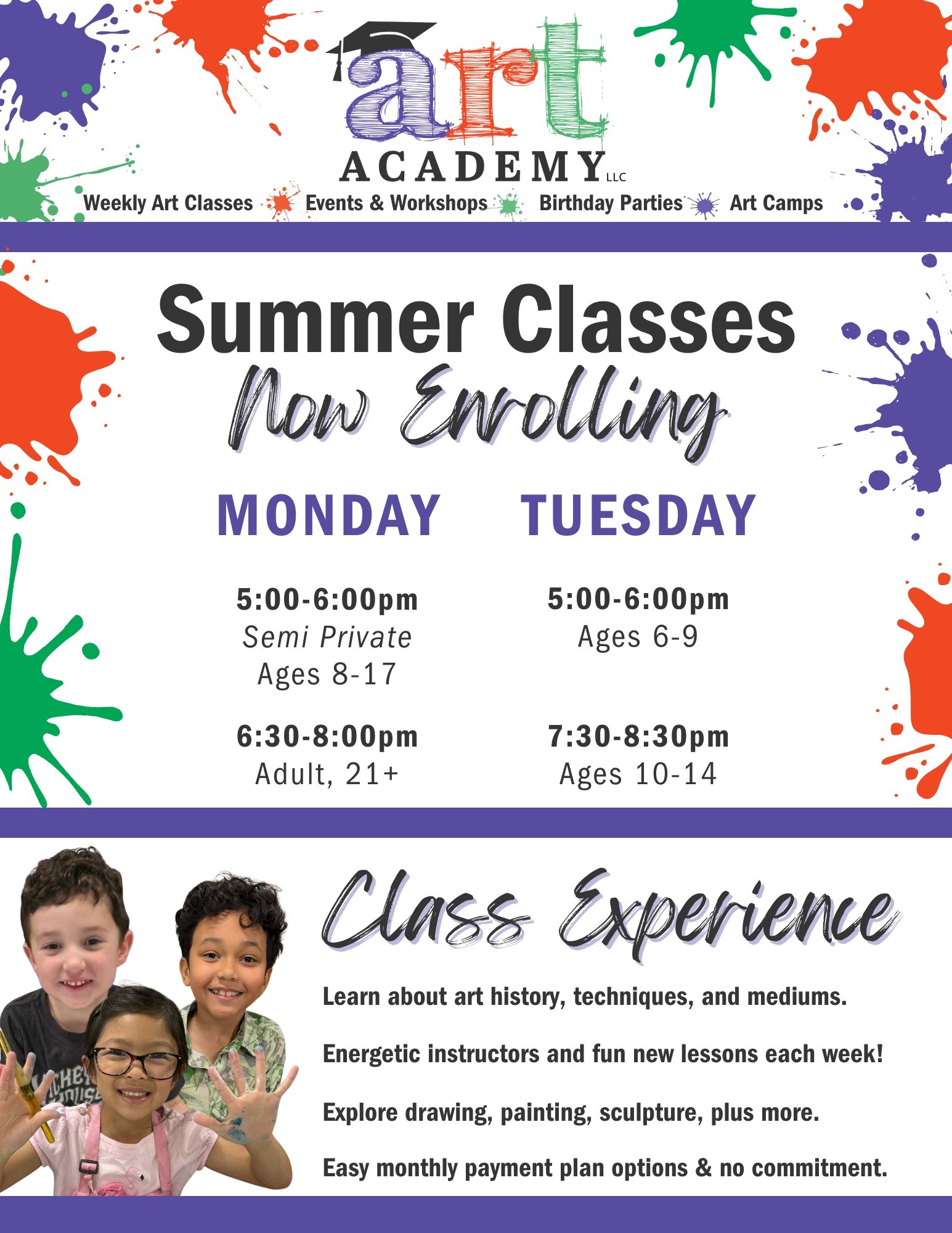 Our weekly classes immerse young artists in the world of fine art in a fun and engaging way. Offered in the spring, fall, and summer, students attend once a week on their designated day and time.