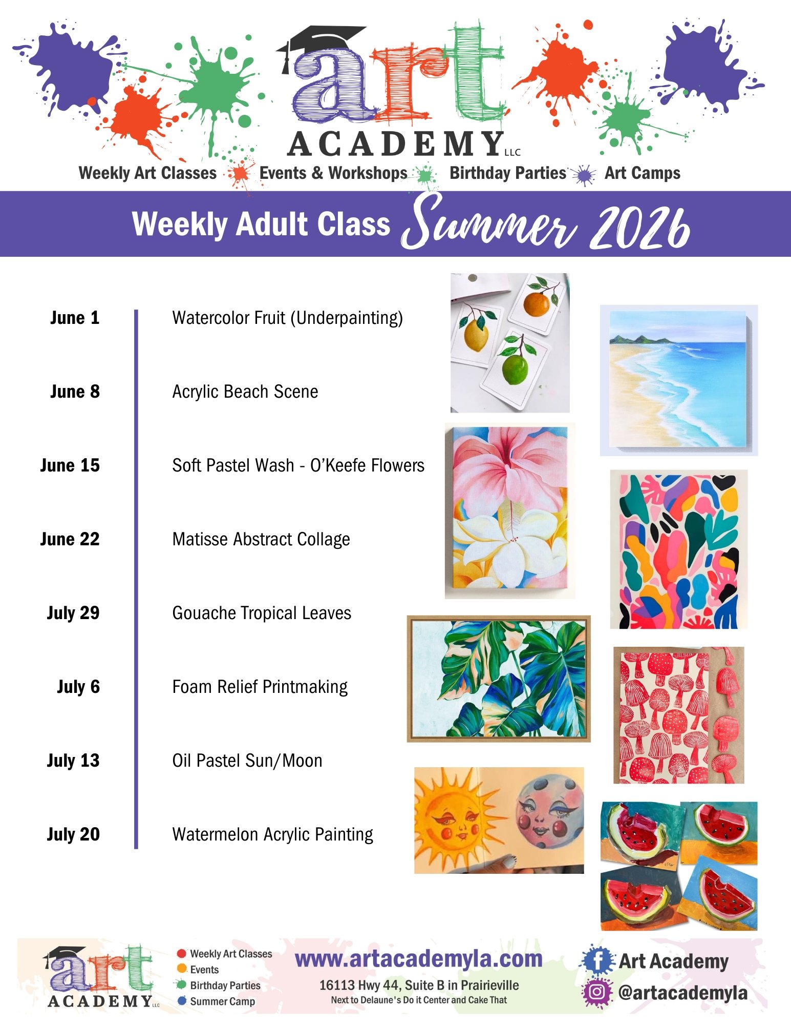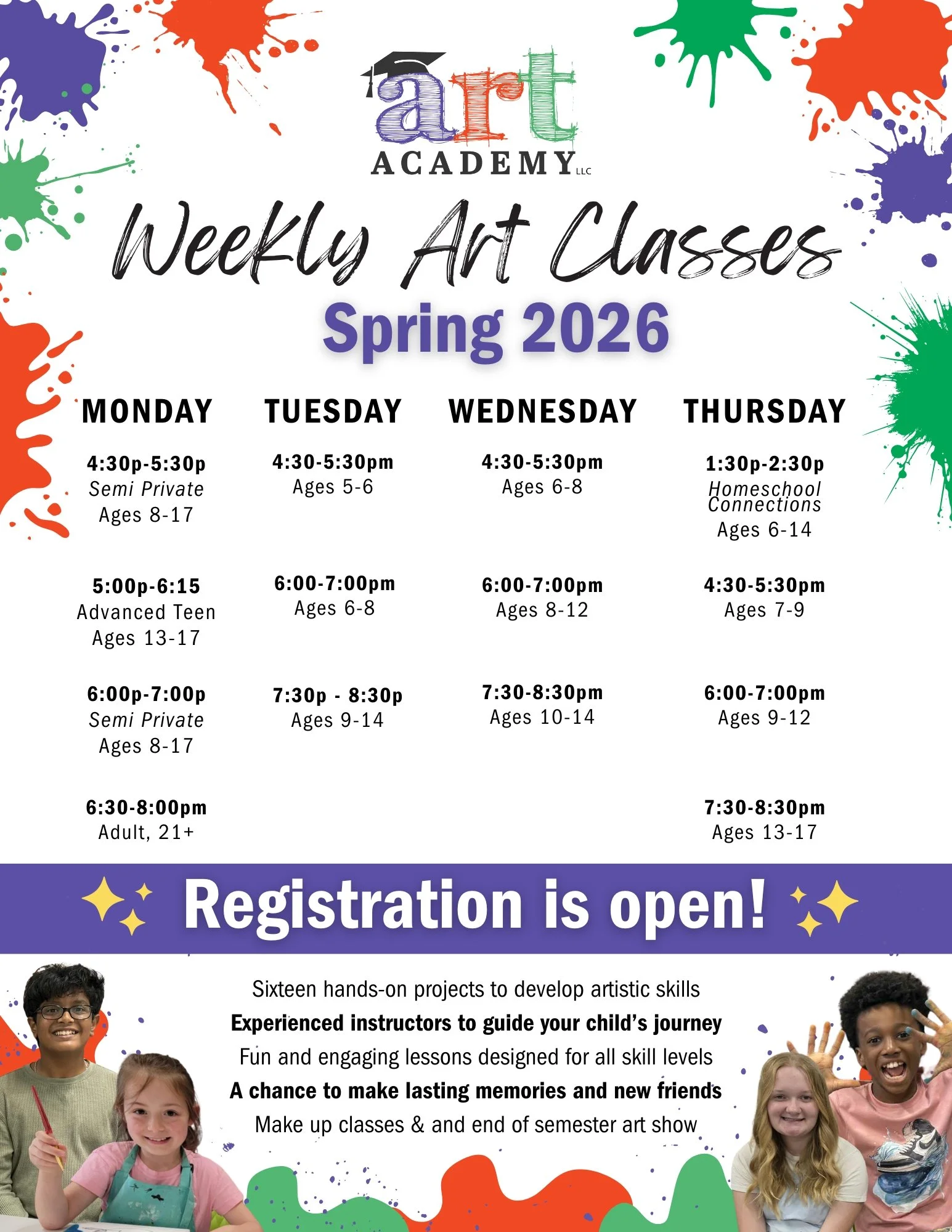 Each semester, students explore art history, learn new techniques, and work with a variety of mediums, including drawing, painting, printmaking, collage, and sculpture. While each class typically completes the same project, lessons are scaled to each age group—younger students start with simplified projects, while older students build on advanced techniques and learning. We always tailor and modify instruction to meet each student’s needs, ensuring a creative and supportive experience for all.